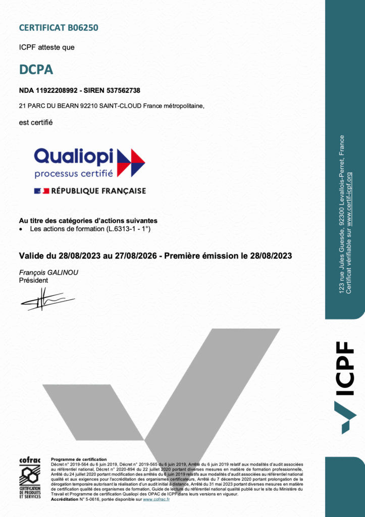Le cabinet DCPA est également organisme de formation (NDA numéro de déclaration d’activité 11 92 22 089 92), certifié Qualiopi depuis le 28 août 2023 dans la catégorie « action de formation ».